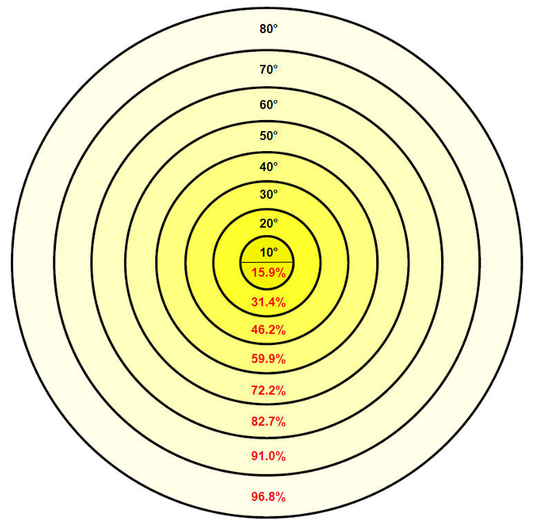 The figure on the right shows the percentage of the total light output of the Aquorea that is contained within each beam angle. Ex. 60° circular beam contains 82.7% of the total light output of the LED.