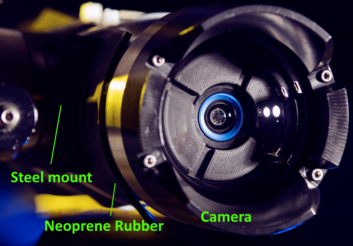 Mounting - The camera, LED, and laser should be attached to a solid mounting point with either stainless steel hose clamps, or a machined mount. Between the camera and mount point, use neoprene rubber, electrical tape, or similar insulation material to prevent corrosion and add vibration dampening. Read more about ROV vibrations here Troubleshooting - Vibration dampening on ROV systems.