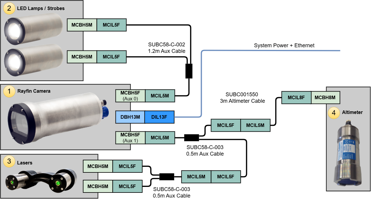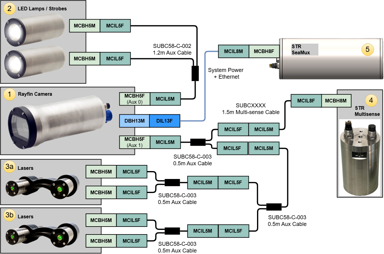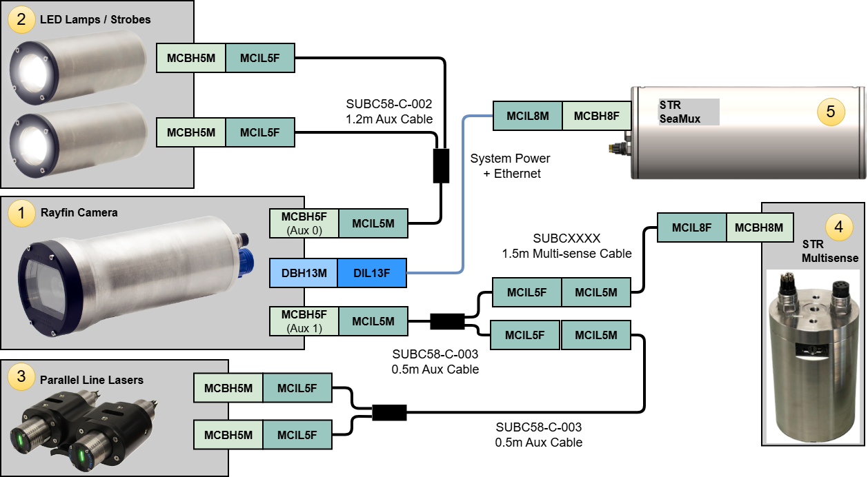 STR SeaSpyder Upgrade with Rayfin: the below diagram represents a system where LEDs, lasers and a STR Multi-sense are connected to the Aux ports. The Rayfin is connected to the STR SeaMux I/O port.