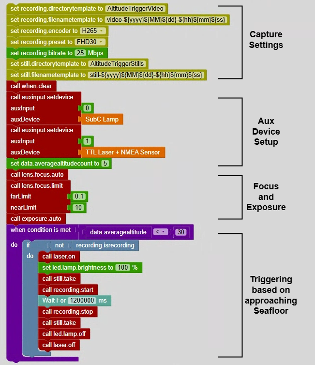 Altitude Trigger Autonomous with Lasers: this represents a system where LEDs and lasers are enabled and recording or digital stills are triggered based on the distance to seafloor from the attached altimeter.