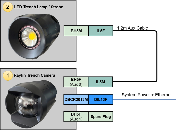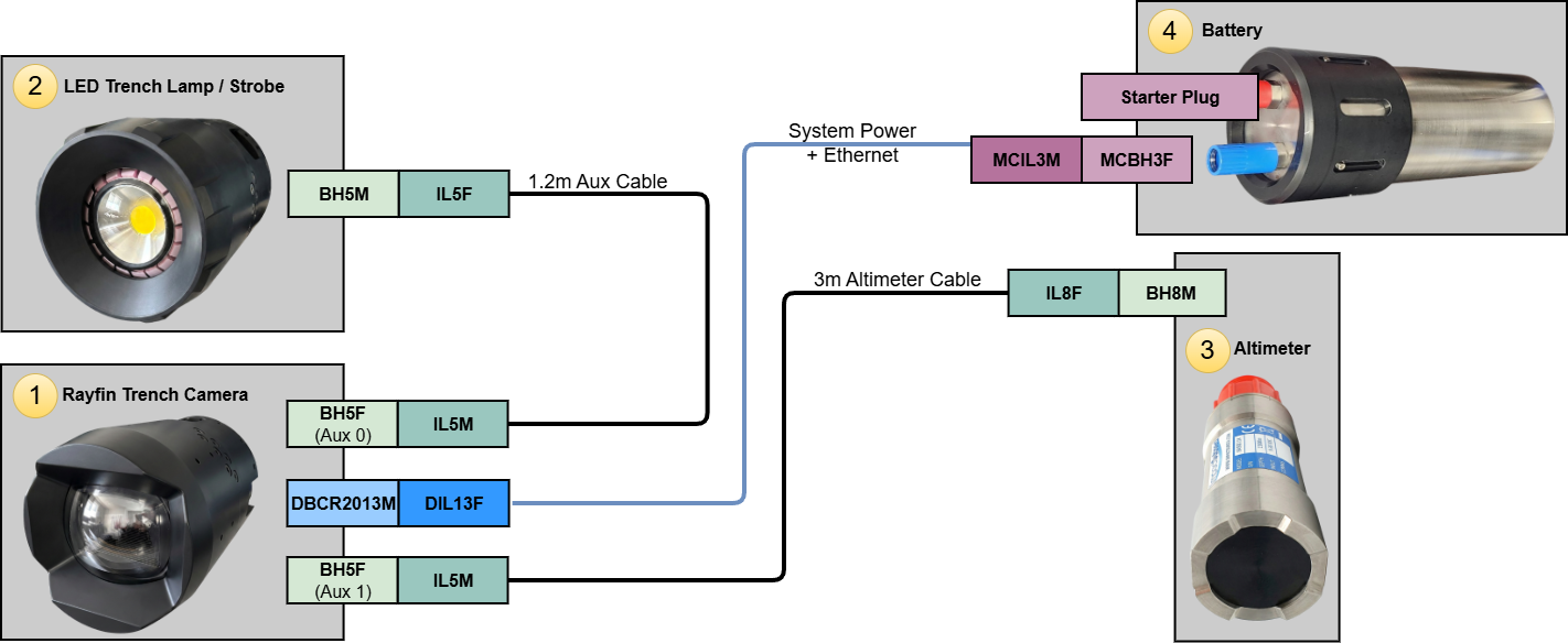 Altitude Trigger Autonomous Example: This setup represents a typical setup for an autonomous camera system with the addition of an altitude sensor. The system is then able to trigger LEDs, recording or digital stills based on the distance to seafloor.