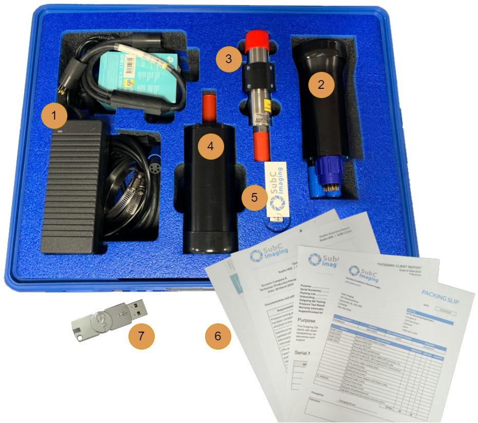 Your shipment will contain the necessary components to power up and test the camera system. This includes the interface cable, USB stick with software, AC-DC power supply, Cat5e Ethernet cable, Aux devices such as LEDs or lasers, and necessary cables to connect equipment.