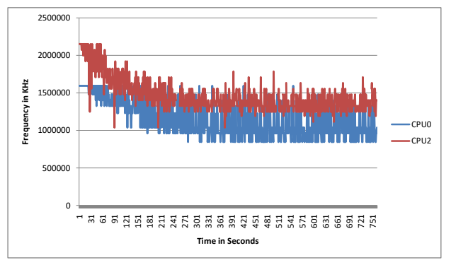 In high temperature environments (>25C), the CPU will throttle its frequency (as shown in graph).