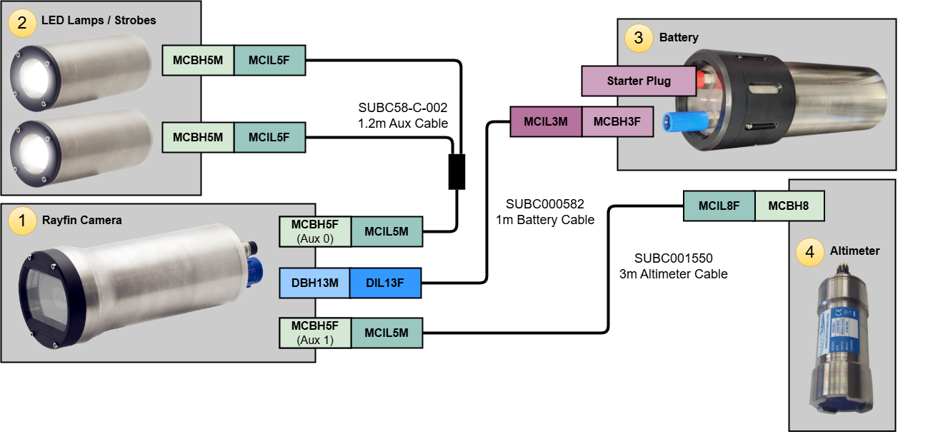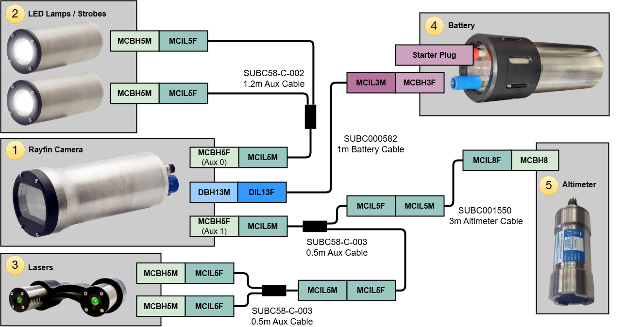 Please note that the diagrams above are examples of wiring diagrams for camera system deployments. Please note that the only components required for the Autonomous Timelapse to function are the Rayfin Benthic(Hibernation) camera and the Battery. The lights and lasers are auxiliary devices that are not necessary but can be purchased from SubC to add flexibility capabilities to your system.