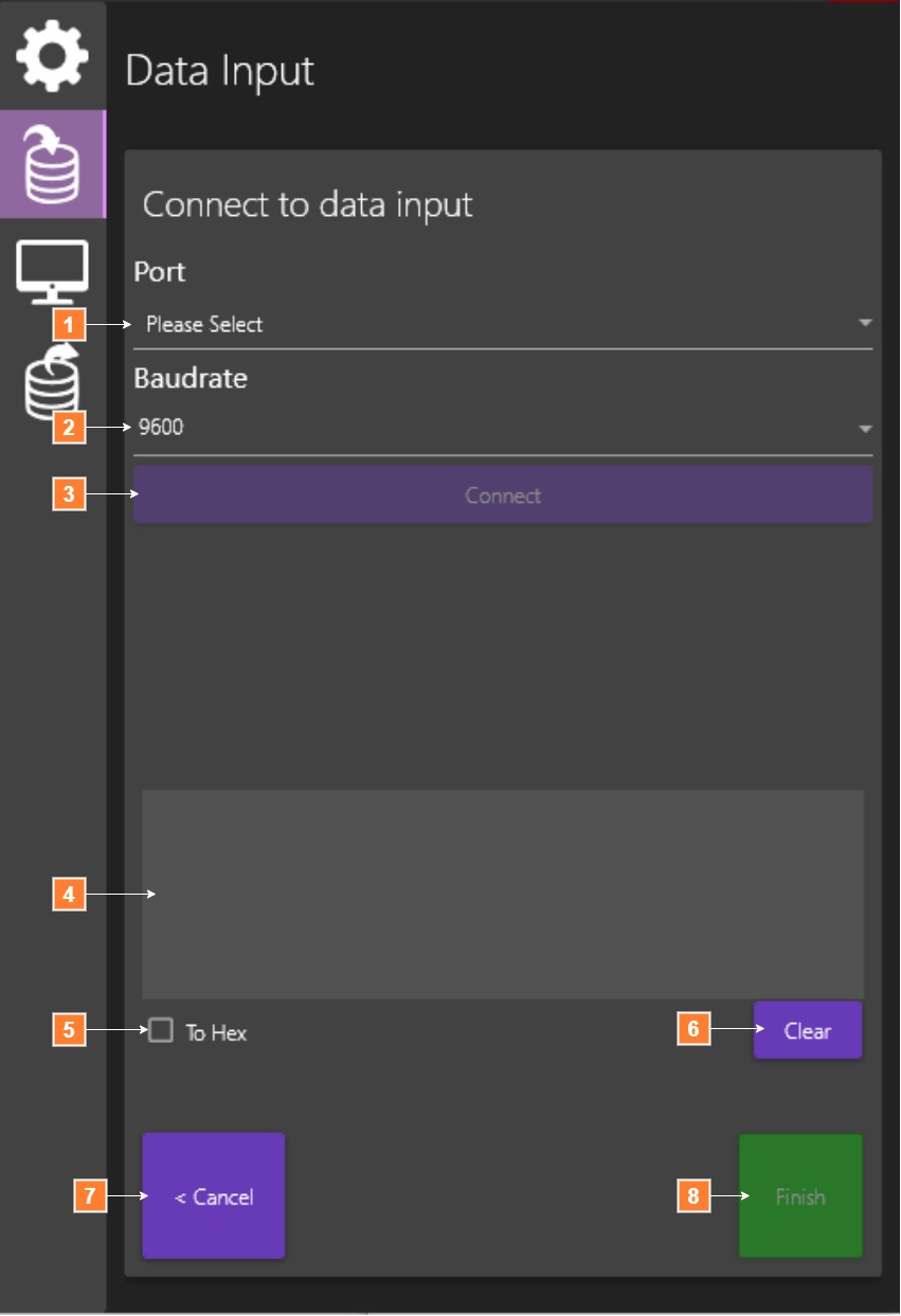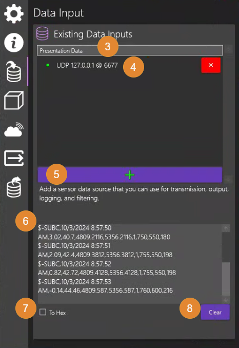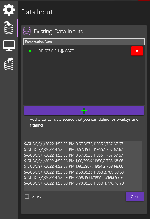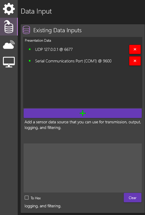 Click “x” if you wish to disconnect from a connected data source.Add ( + ) to add another data source from UDP, TCP and Serial connections. These Data Inputs can then be used for transmission, logging, and filtering