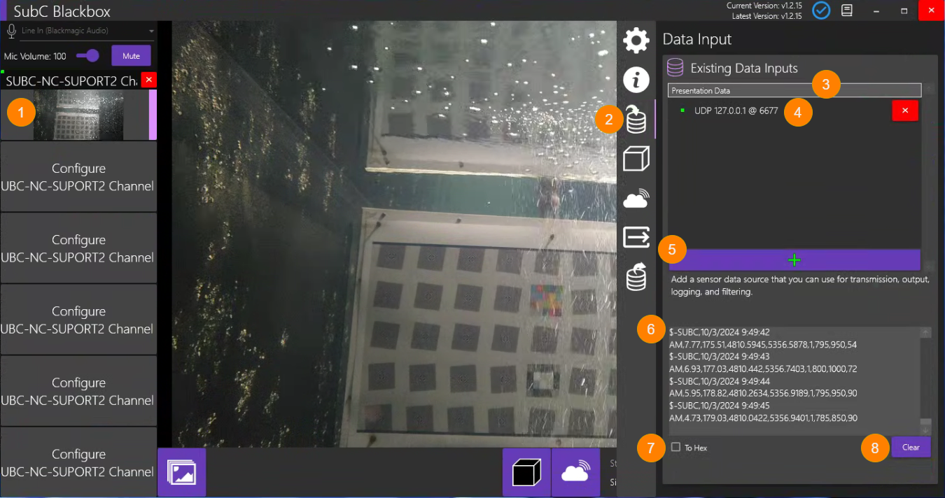 Blackbox provides the option of getting Data Inputs from Rayfin Cameras and other applications or devices, such as those reporting environment sensor data: water temperature, depth, etc. and this data can be displayed on the video view as a Data Overlay and/or save to a specified file.