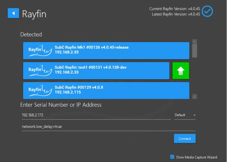 If you see a green arrow displayed next to the Rayfin camera (as shown in example image below) this indicates that there is a newer version of Rayfin ROM & Firmware available for this camera.