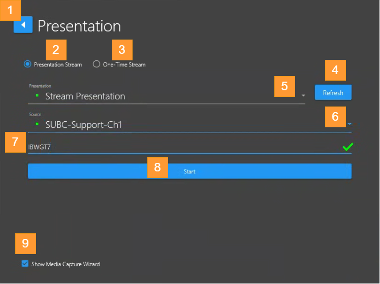 Presentation – Drop-down field shows a list of Presentations created in the SubC Streaming Service Web application from which you can select.