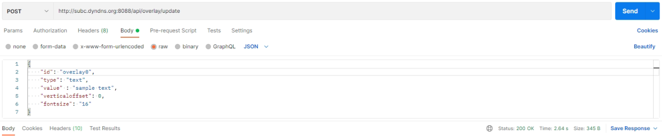 | Adds an overlay to the top left hand corner (text only). Replies with status 200 when operation is valid. |