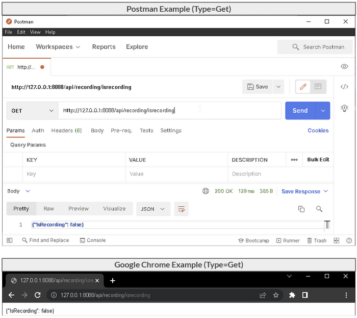 The result is a reply showing the IsRecording status to be true or false. The shown example displays false to indicate that no recording is started.