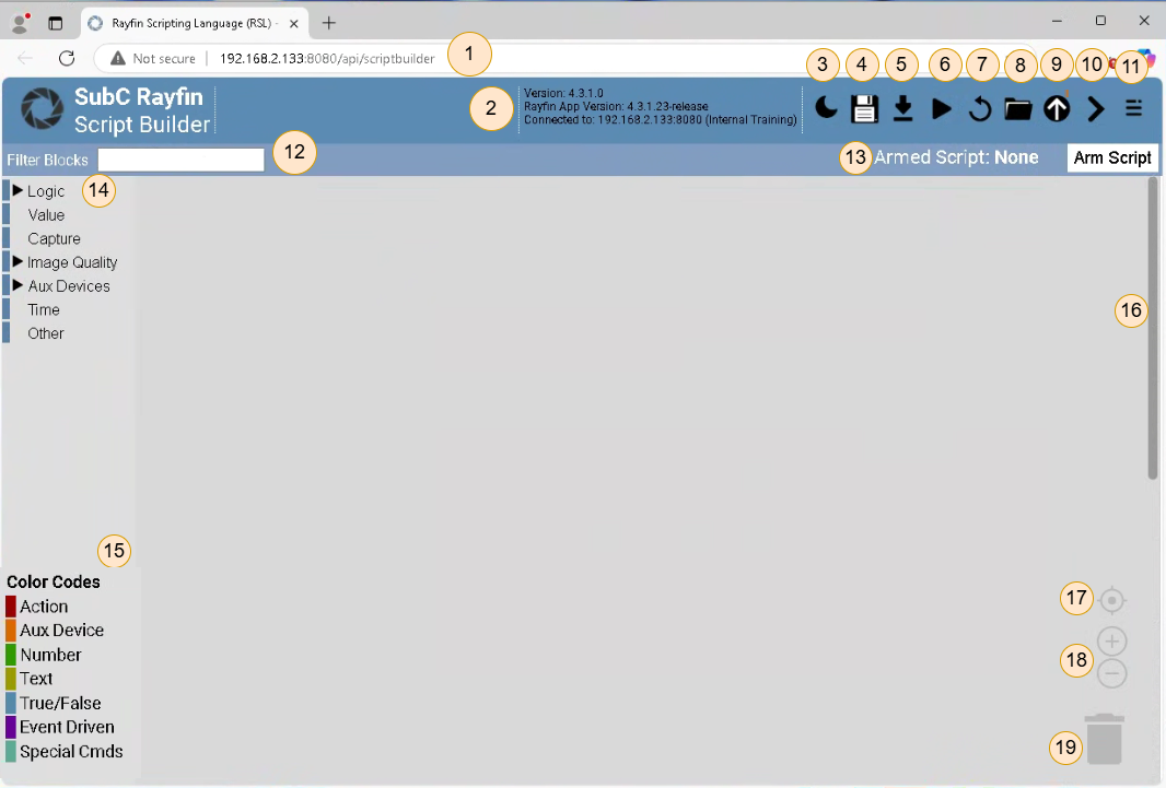 Rayfin Visual Script Builder version & connected Rayfin camera details.
