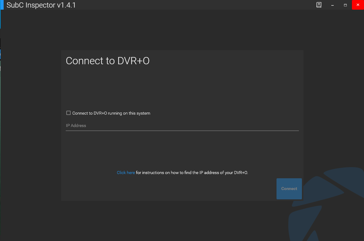 The typical use is to have DVR+O running on one system and Inspector running on another system. However, if you wish, you can run Inspector on the same system as DVR+O. To do so, we’ve added a convenient checkbox button “Connect to DVR+O running on this system” or you can enter the loopback IP 127.0.0.1 on the IP Address field to connect Inspector to DVR+O on the same system.