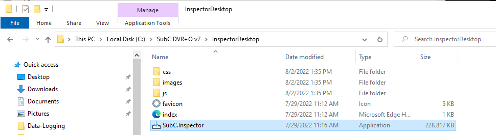 When you install SubC DVR+O v7, the Inspector Desktop Application installation package is located in the DVR+O folder: C:\SubC DVR+O v7\InspectorDesktop\SubC.Inspector