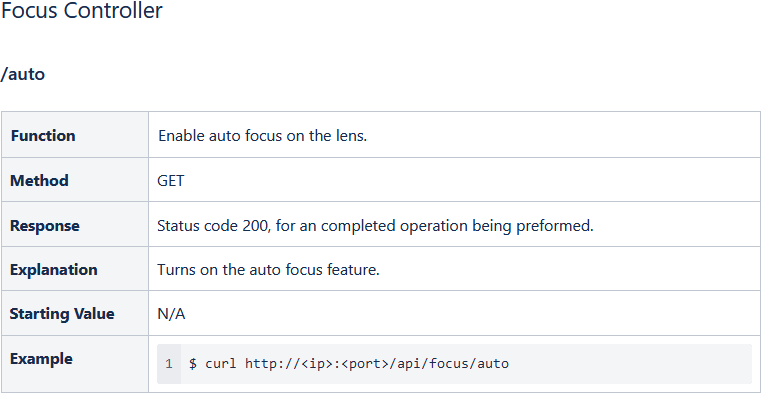 If we want to set the camera to auto focus, we start with the base of http://192.168.2.99:8080/api/focus/auto.