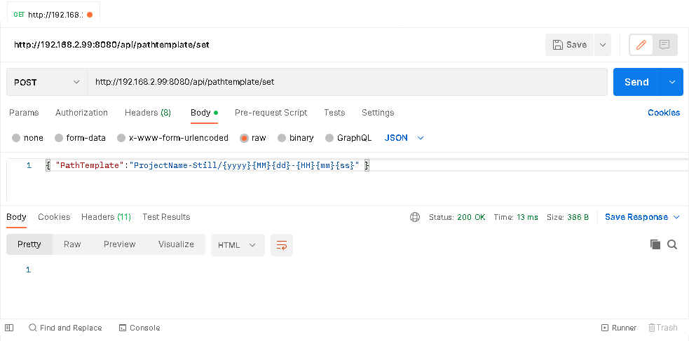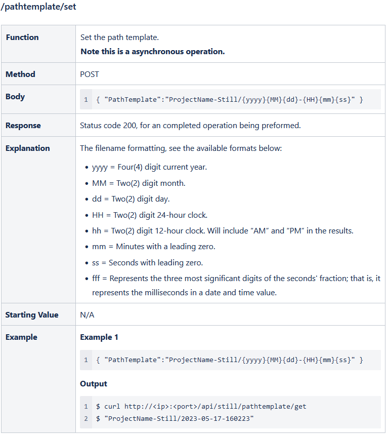 Example: { "PathTemplate":"ProjectName-Still/{yyyy}{MM}{dd}-{HH}{mm}{ss}" }Click the Send button