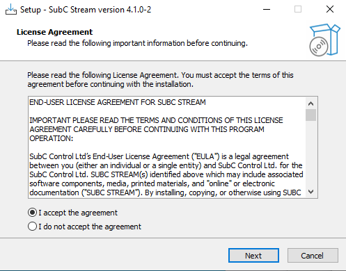If this is the first time a SubC product is installed on this System, you may additionally see .Net software installing. Simply accept the defaults and allow it to install.
