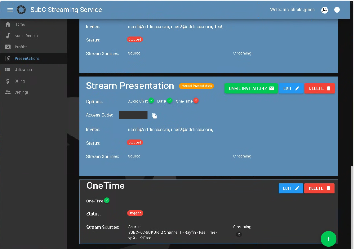In the SubC Streaming Service Web application, select Menu → Presentations to create and see your list of Presentation.