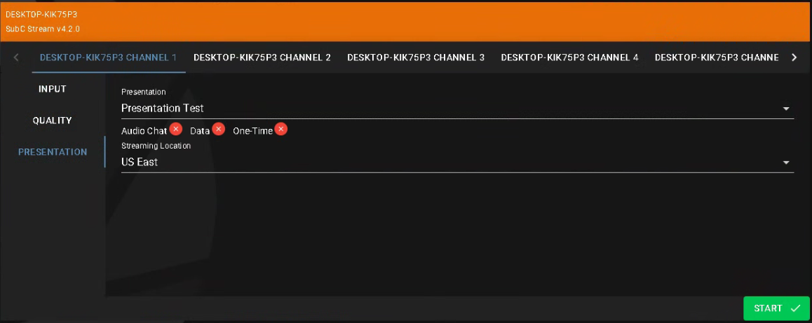 You can Start | Stop the Channel Streaming from within the Stream Desktop application, however it is often convenient to remotely Start | Stop the Channel Streaming via the SubC Streaming Service web application.