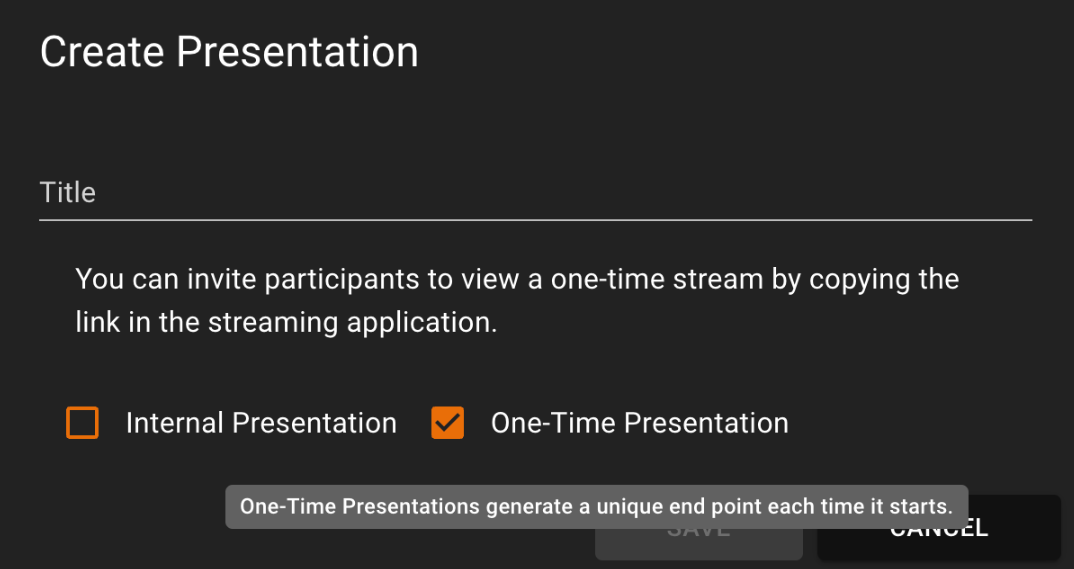 See Audio Chat & Audio Rooms section for more details.One-Time - One-Time Stream is optimized for quickly sharing a single channel of video, (without the need for an access code as is an option in regular Presentations). The link to a One-Time Stream will expire as soon as the Channel stops streaming, and a new link will be generated each time the Channel streaming is started again. See Presentations → One-Time Stream
