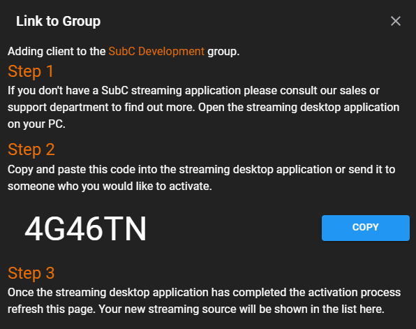 This code is used to add a system running a stream enabled SubC desktop application to the current SubC Streaming Service Group.